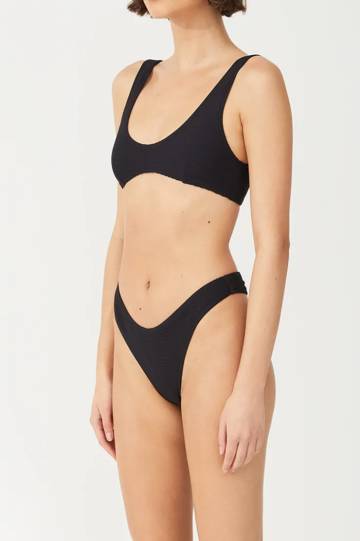 The Crop Bralette Top by Zulu & Zephyr is cut from sustainable ECONYL® ribbed lycra. With a low-cut neckline and fixed straps, this top has a sporty feel. Pair back with the new Signature Thong Brief for a minimal summer combination.