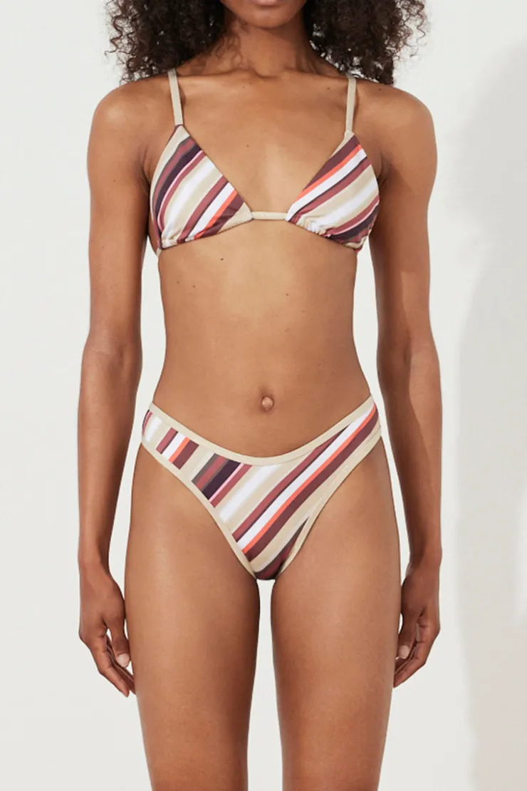 The Golden Retro Stripe Triangle by Zulu & Zephyr is a minimal shaped Tri featuring a soft bust without padding, and adjustable golden shoulder straps, in a brushed custom printed stripe fabrication with a soft luxe feel. Pair with the coordinating Golden Retro Stripe Curve Brief to complete the set.