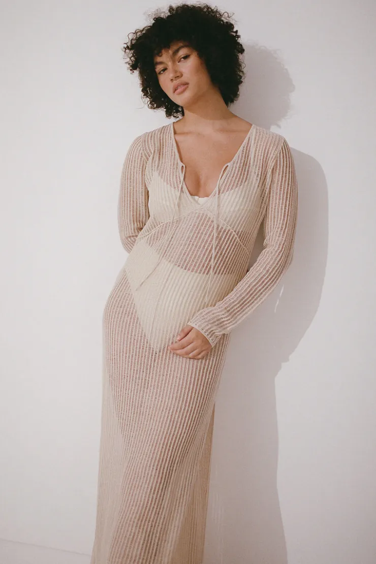 The Husk Lattice Knit Dress by Zulu & Zephyr is a piece to treasure, featuring a long sleeve, bust seam detailing, side splits reaching around mid-thigh, and a flattering bust tie. A soft knit, this style has a luxurious yet durable feel. Wear over the Signature Balconette Bra Cup Top – Coconut and the Signature High Waisted Brief – Coconut for effortless poolside glamour.