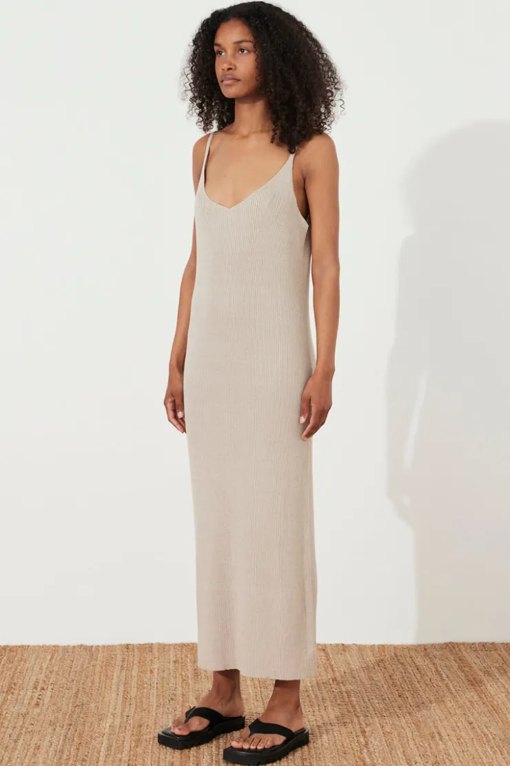 The Husk Rib Knit Dress by Zulu & Zephyr features a soft slinky rib knit, fine fixed straps, and a feminine V-neckline. The Maxi length Dress is considered an elevated basic and can be worn throughout the seasons. Pair with the Zulu & Zephyr Thong – Natural for a day-to-night look.