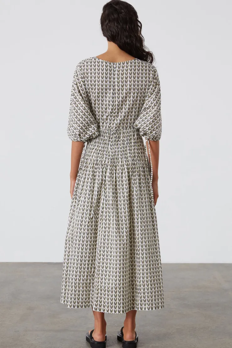 The Pecan Rouched Organic Cotton Dress by Zulu & Zephyr offers a crisp hand feel paired with a custom hand-painted print for a one-of-a-kind look. The dress features a flattering V-neckline with a chic cut-out detail at the front, and a shirred elastic waistband for added shape. A functional drawcord across the back bodice enhances the design while allowing for a perfect fit. With an invisible zipper at the centre back and a relaxed-fit skirt, this dress effortlessly blends style and comfort, making it a go-to for any occasion.