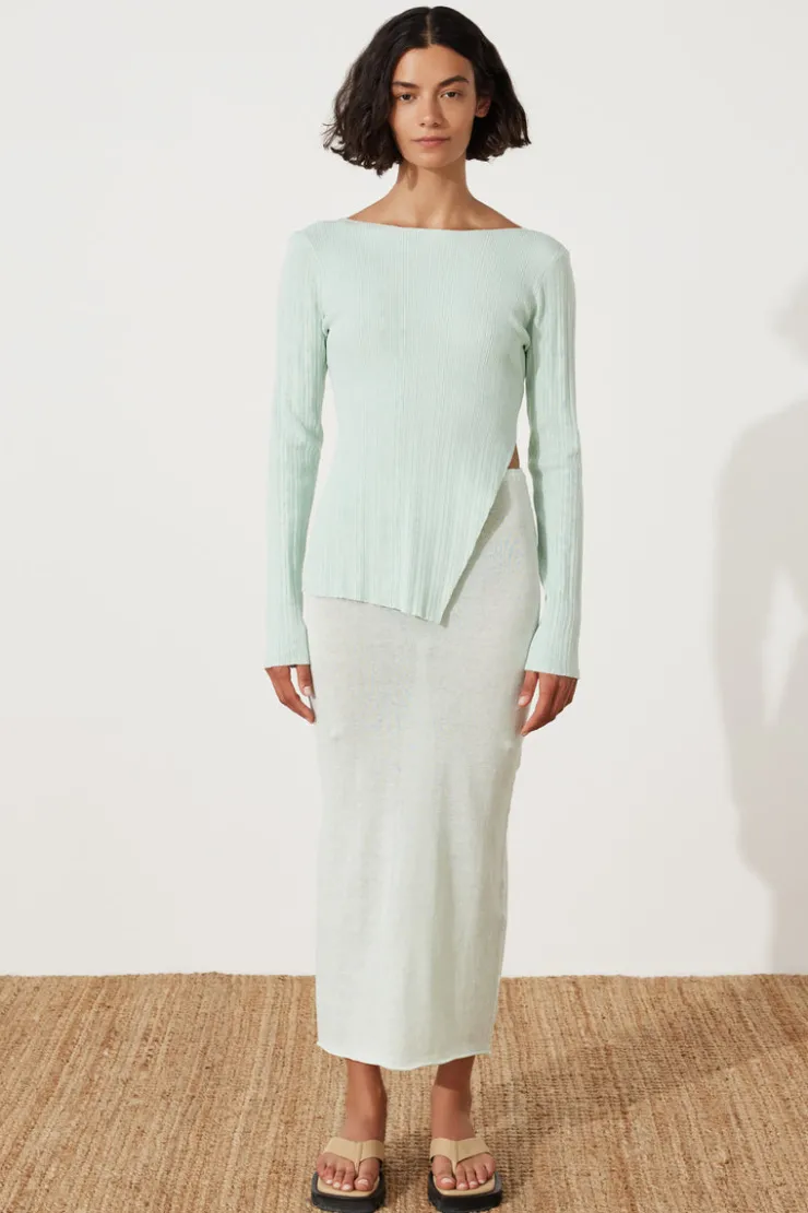 The Seaglass Rib Knit Top by Zulu & Zephyr features a soft rib knit fabric with an asymmetric hem and a high split, complemented by a classic high-relaxed neckline. Crafted in a warm Seaglass green, this top is the perfect pairing piece for any outfit.