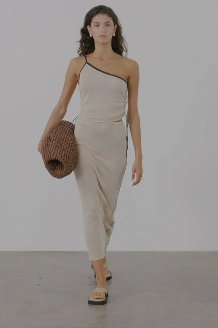 The Stone Stripe Organic Cotton Blend Knit Crop Top features contrast drawcord channels at the side seams, offering an adjustable ruched effect that adds both dimension and style to the design. Designed with a chic one-shoulder strap, this top is perfect for casual wear or paired back with the Stone Contrast Knit Skirt for an evening look.