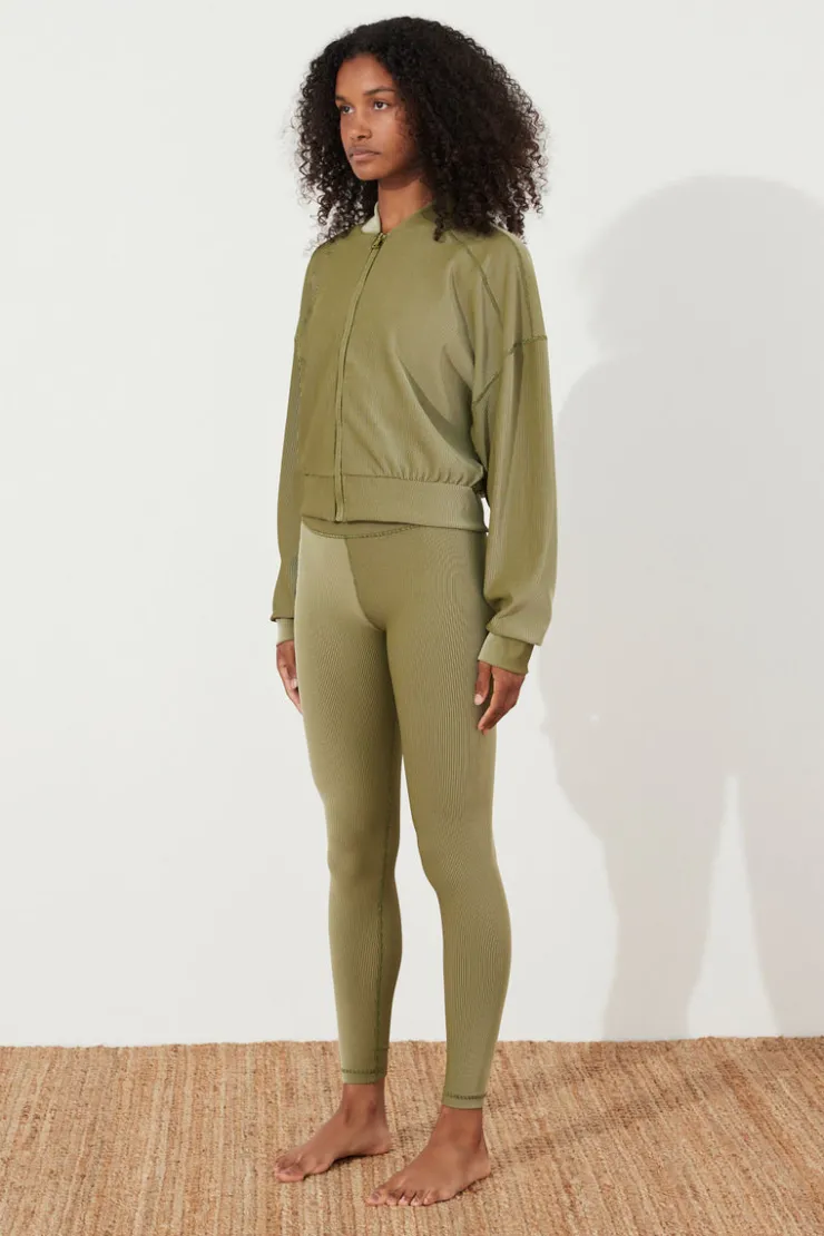 The Olive Stripe Rib Legging Zulu & Zephyr features a wide waistband for comfort and support, a sculpting high-rise fit and tapered leg. The two-tone ribbed legging is designed for high-endurance activity or simply as luxury everyday athleisure wear, and forms part of the new ZZ Sport range. Pair with the Olive Stripe Rib Jacket to wear this functional piece from Pilates to lunch.