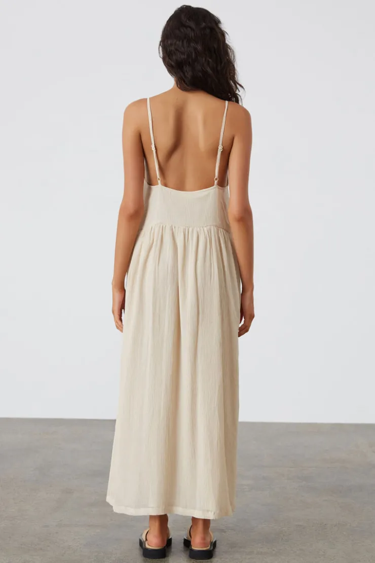 Embrace effortless elegance with the Stone Textured Dress, a luxurious addition to your resortwear wardrobe. The Dress features a sheer textured fabrication, offering a breezy, lightweight feel. The dropped waistline with soft gathers enhances its relaxed yet feminine silhouette, while the 100% cotton lining ensures all-day comfort. Adjustable straps and OEKO-TEX® 100 standard hardware add a touch of practicality and sustainable luxury. Perfect for special occasions or poolside lounging, this dress is a must-have for effortless resortwear styling.